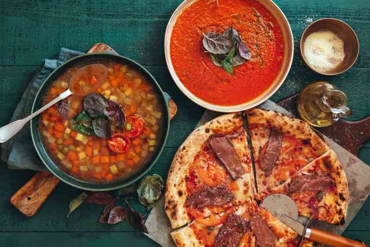 The Sunset pizza is a must-try, featuring tomato, smoked provolone, sausage, grilled aubergines, grilled peppers and grilled courgettes.